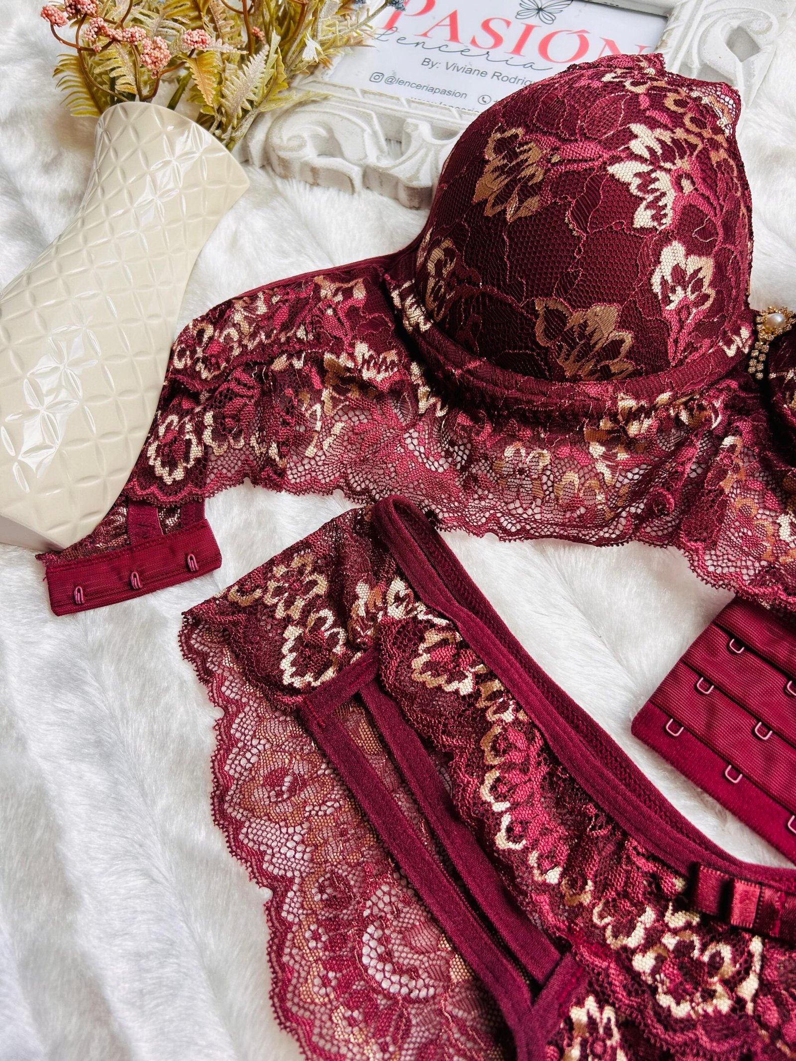 Conjunto Lencería Vino Encaje Pasión