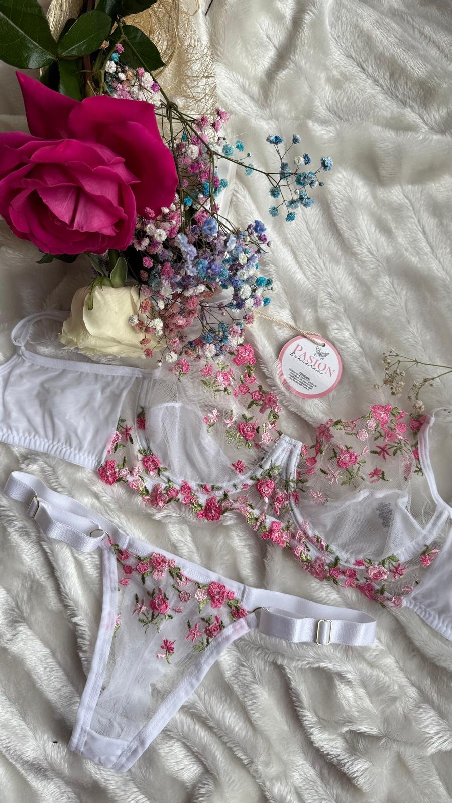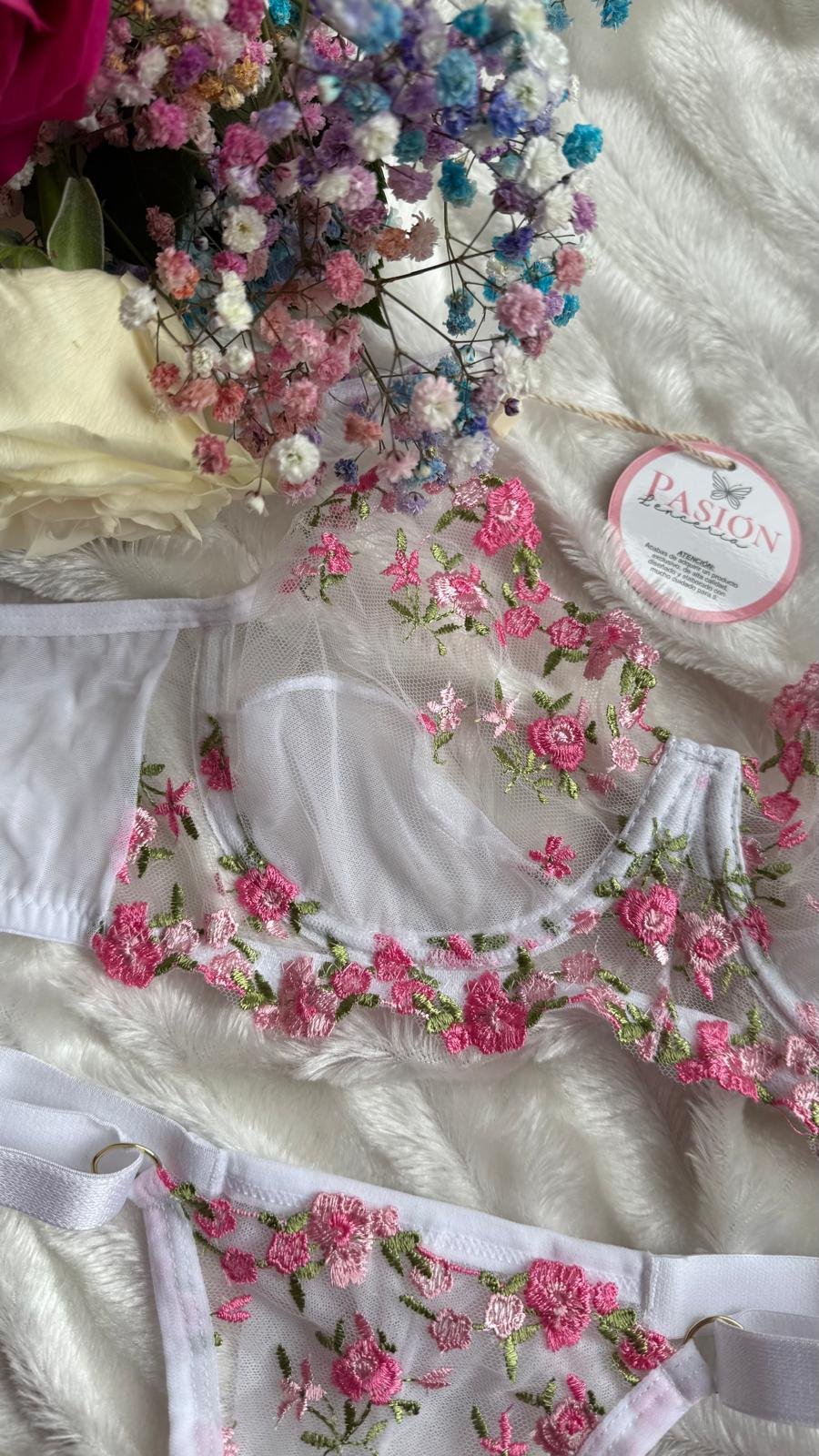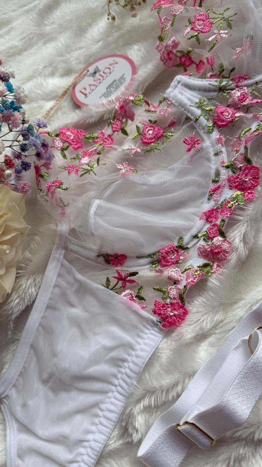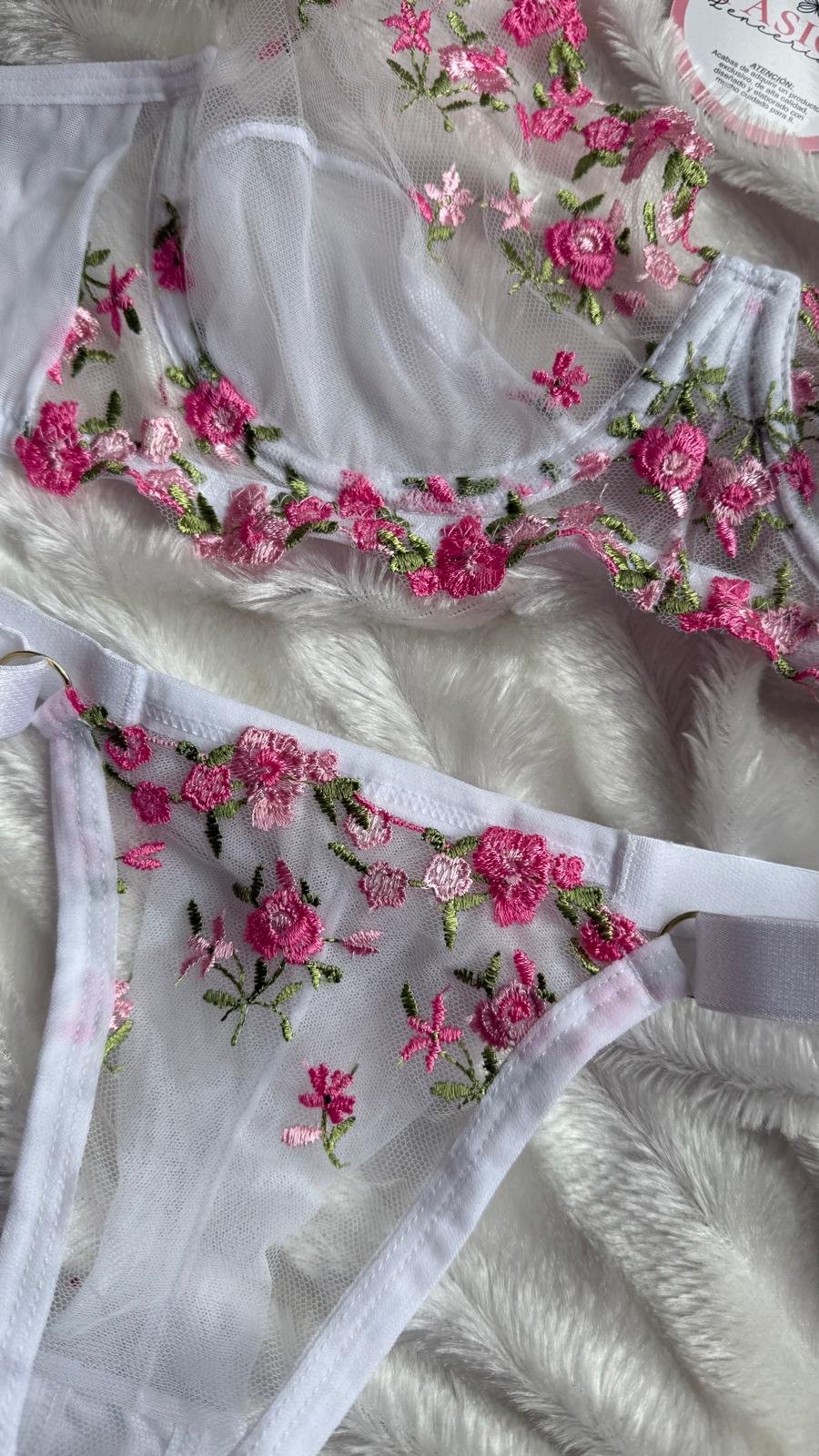 Enamórate de la delicadeza de este conjunto de lencería en tul bordado floral, diseñado para realzar tu feminidad de forma suave y elegante. Su tejido transparente con bordados en flores aporta un aire romántico y sofisticado, dejando la piel sutilmente a la vista.