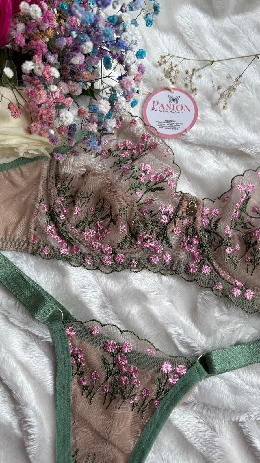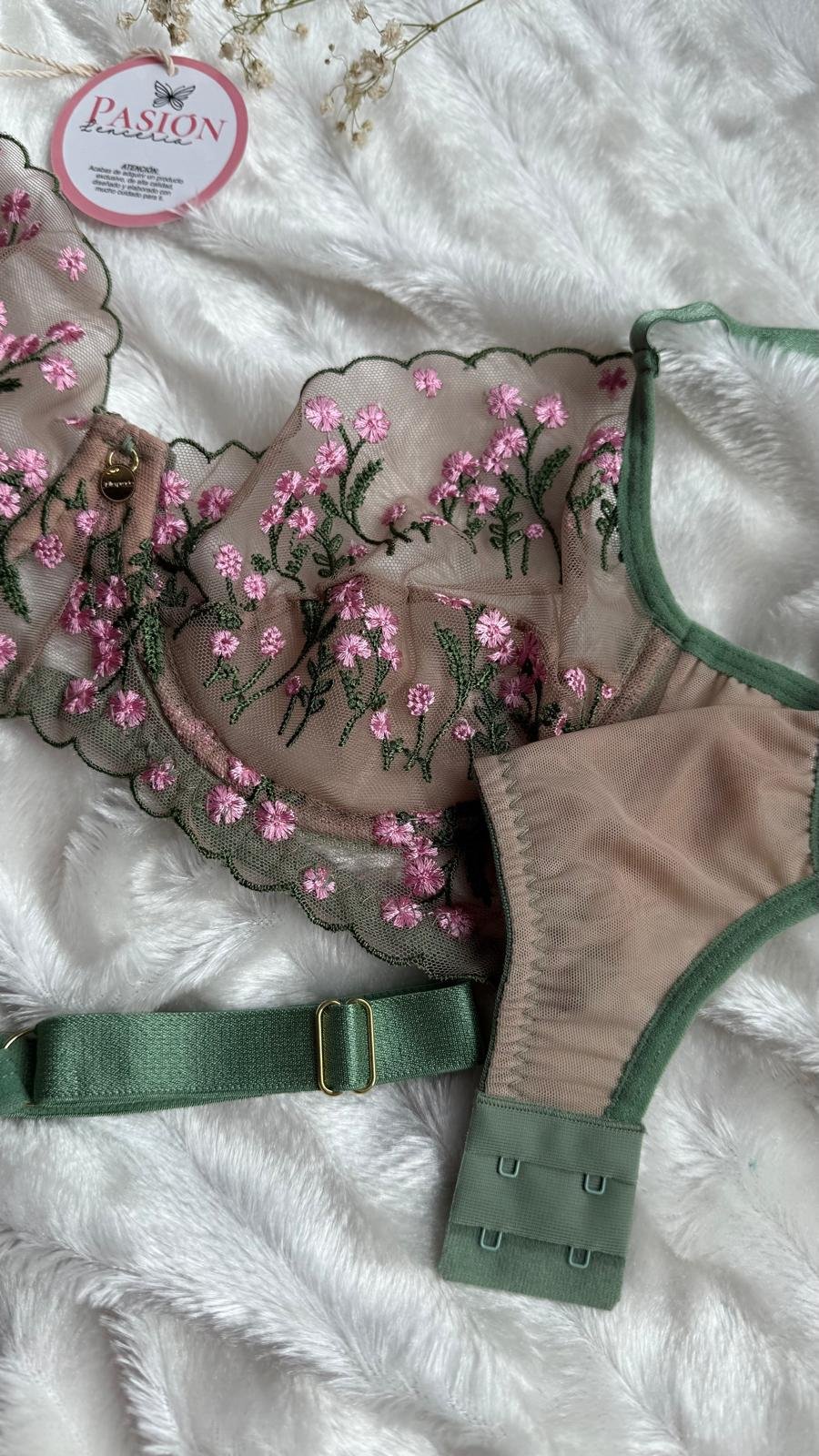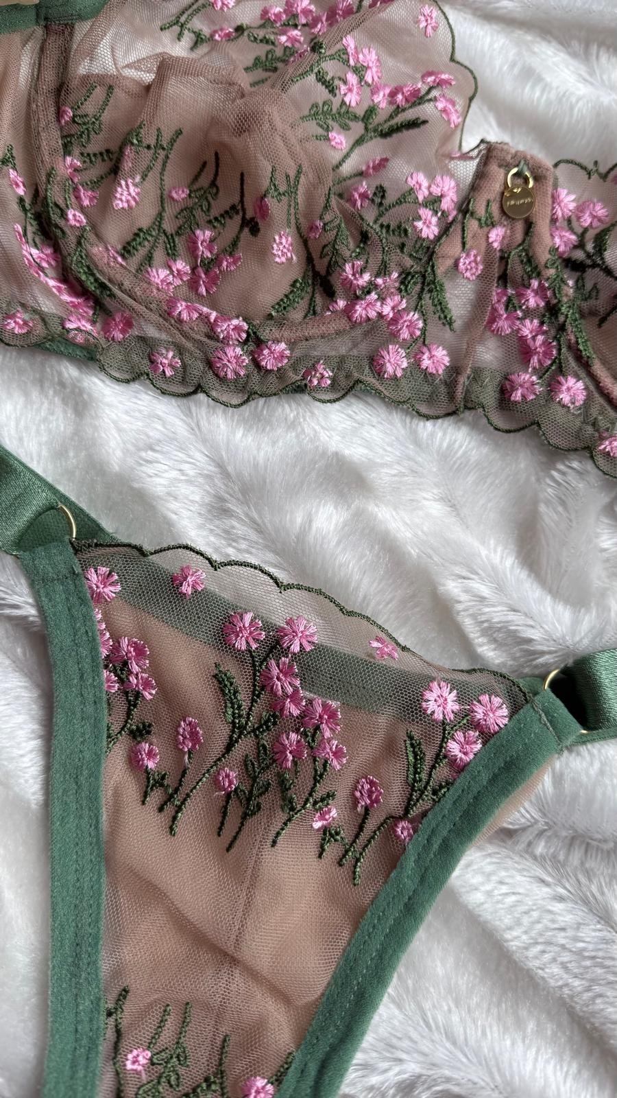 Déjate envolver por la elegancia y el romanticismo de este conjunto de lencería en tul bordado floral. Su delicado tejido transparente en tono nude, combinado con bordados en flores y detalles en verde, crea un contraste sofisticado que realza la silueta con sutileza y sensualidad.